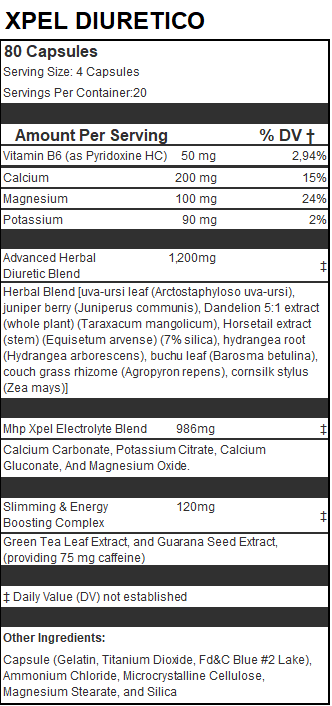 MPH XPEL Herbal Diuretic es un suplemento diurético extremadamente efectivo, diseñado para ayudar al cuerpo a eliminar todo la retención de líquido, producida por la retención de agua que almacena nuestra piel.
