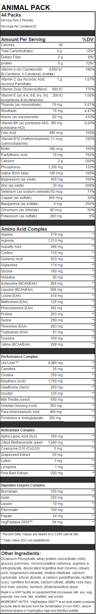 UNIVERSAL Animal Pak 44 packs en primer lugar ofrece una excelente combinación de vitaminas, minerales, aminoácidos, extractos herbales y enzimas digestivas que contribuirán a conseguir excelentes resultados a nivel deportivo.